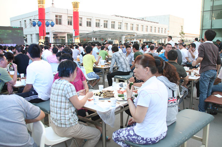 下午5點(diǎn),在夕陽的映照中,公司辦公樓前,忙碌的員工穿梭在會場,辦公樓南面已搭建好舞臺,碩大的LED屏矗立在舞臺上。舞臺兩側(cè)各豎立著兩個團(tuán)結(jié)柱。舞臺前的空地上,已擺放好63張桌子,每張桌子配放6把椅子。桌子上,豐盛的飯菜已放好,靠西邊的草坪旁,是備好的新鮮的青島扎啤。